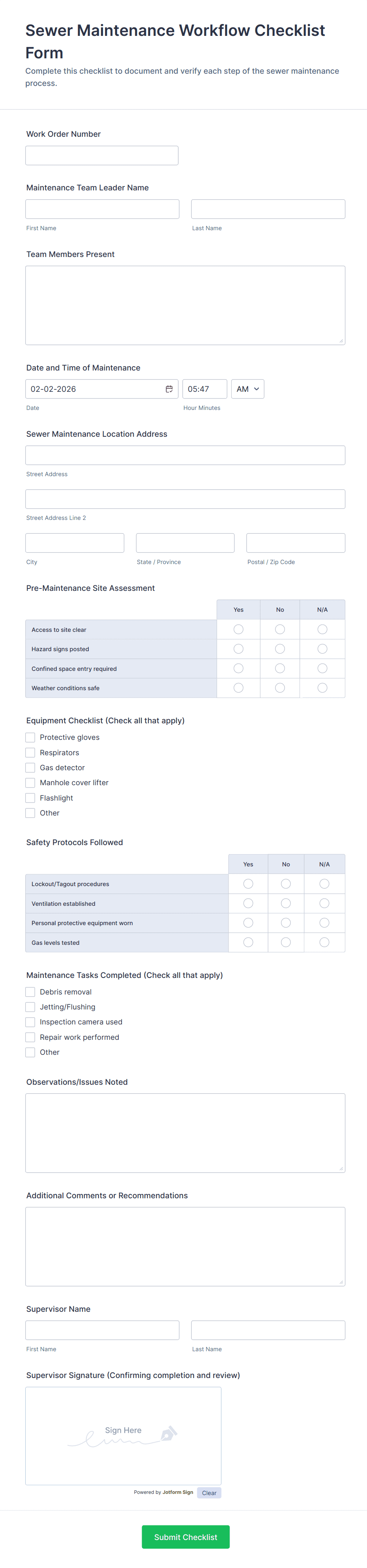 By following these steps, you can create a checklist form that streamlines your processes, ensures consistency, and provides valuable documentation for compliance or reporting. Jotform’s flexibility allows you to adapt your checklist forms as your needs evolve, making it a powerful tool for ongoing task management.