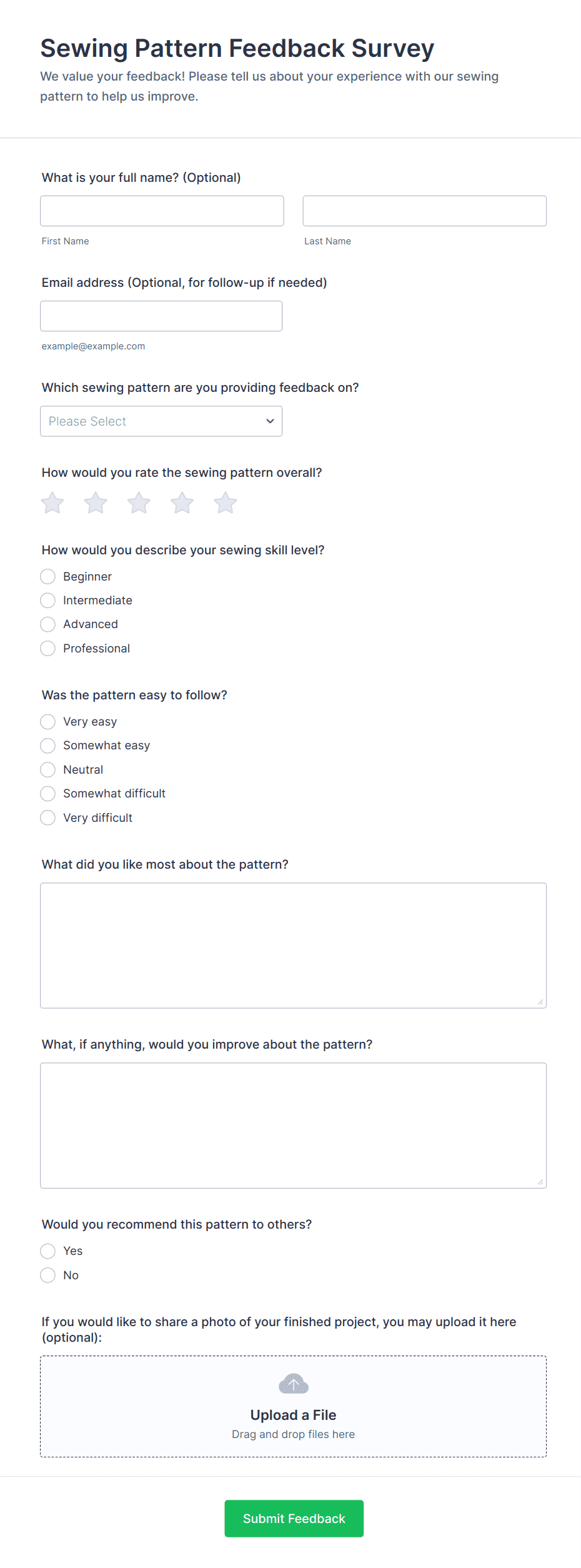 • For customer feedback, include questions about satisfaction, product quality, and likelihood to recommend.