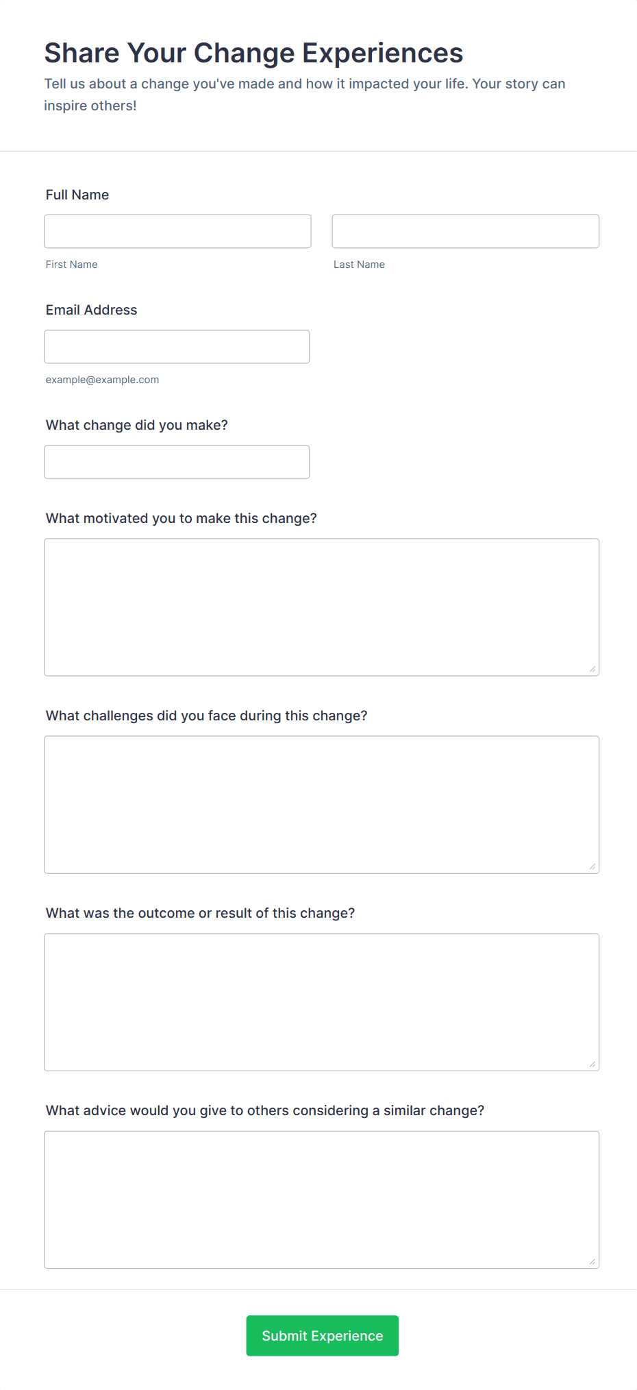 This simple Testimonial Form template allows you to give your users an option to set the testimonial public or private, and provide your users an option to upload images and videos with their testimonial.