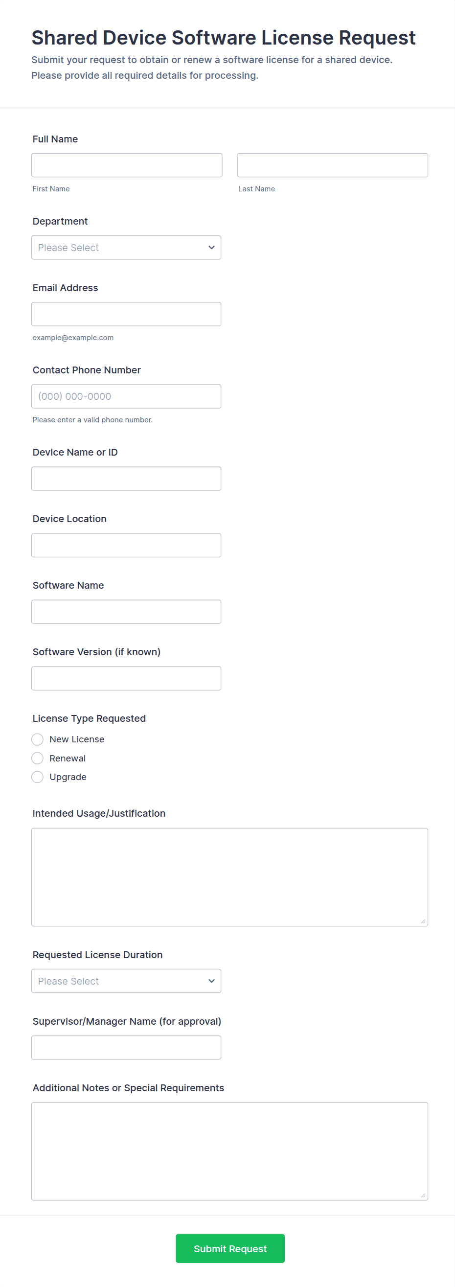 • Hardware Requests: Forms may include fields for device type, quantity, justification, and delivery location.