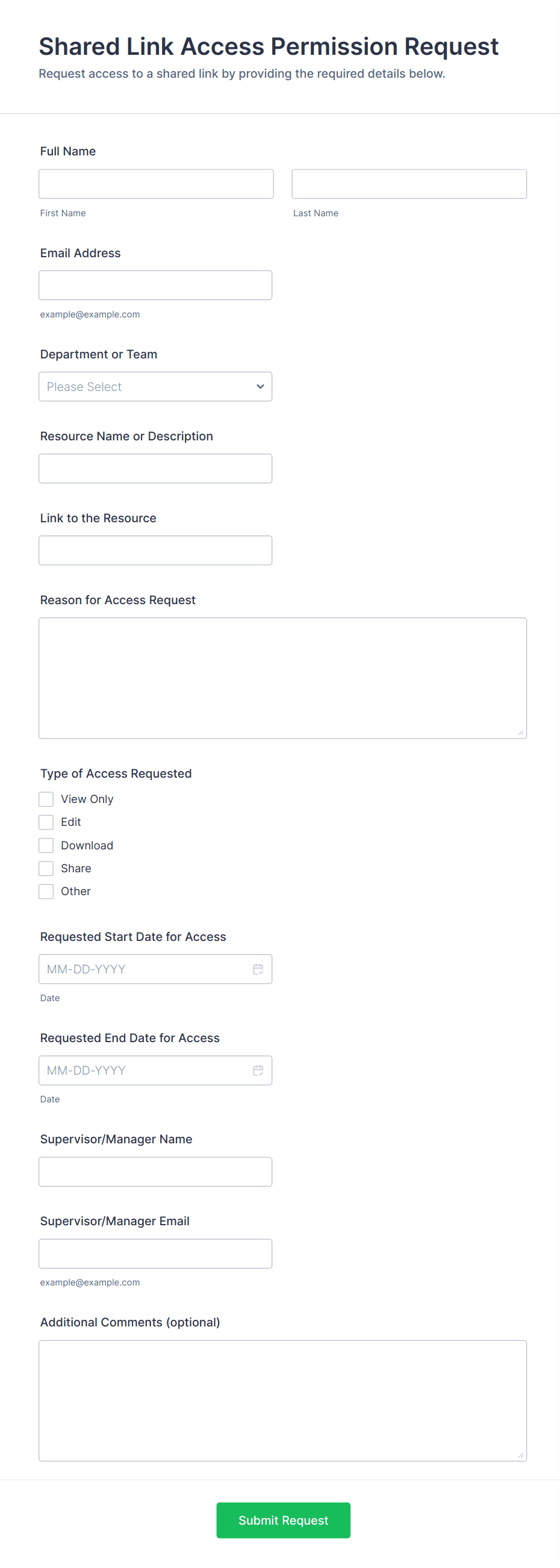 Collect requester name, department, contact info, and access type (physical, system, visitor). Include the reason for access and requested dates.