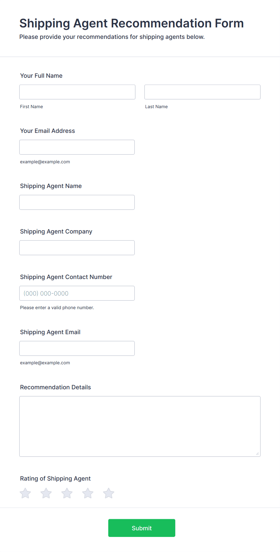 Common fields include contact details, job titles, service or product selections, payment information, feedback ratings, and document uploads, depending on the specific use case.