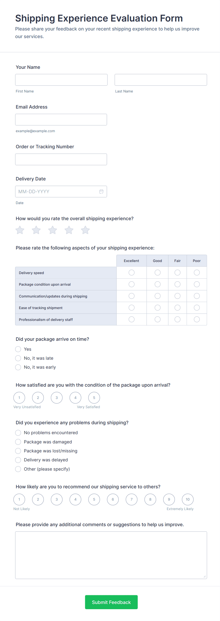 - Retail feedback forms may include order details, product ratings, and delivery experience questions.