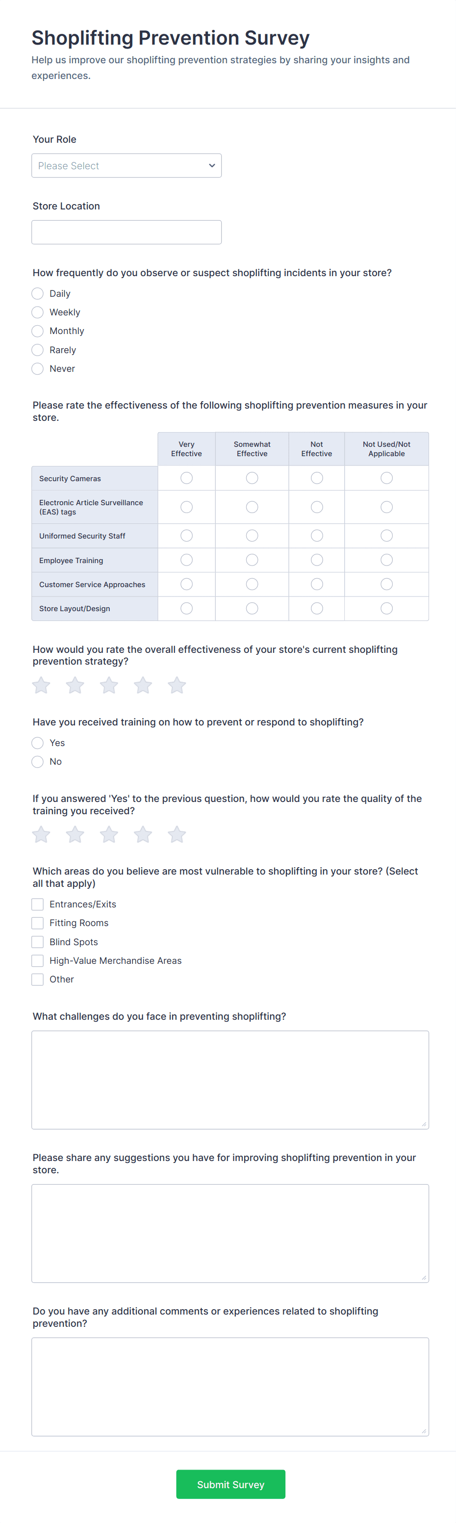 For employee surveys, consider adding anonymity options; for customer surveys, include contact fields if follow-up is needed.