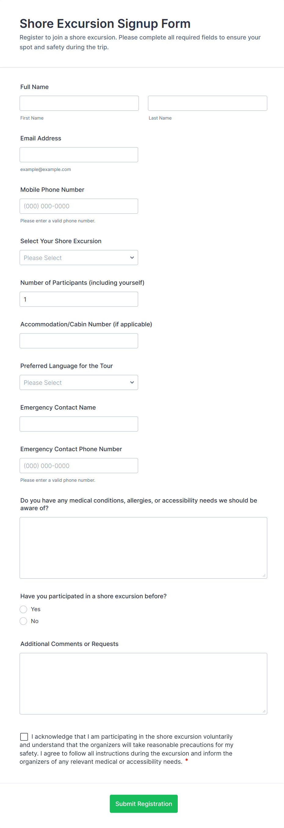 • Tour Registration Forms: Include group size, activity preferences, dietary restrictions, and emergency contacts.