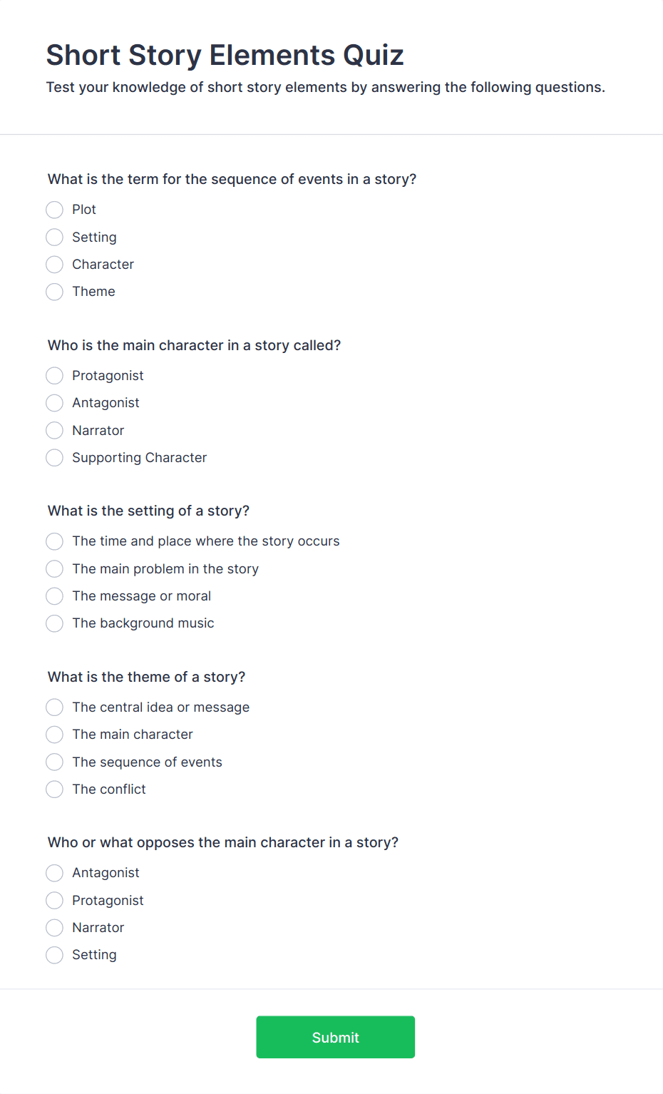 Test your students on what they know with our free online Multiple Choice Test Template! Just add your test’s questions and answers to this template, embed the test on your website or email a link to students, and start accepting submissions instantly.