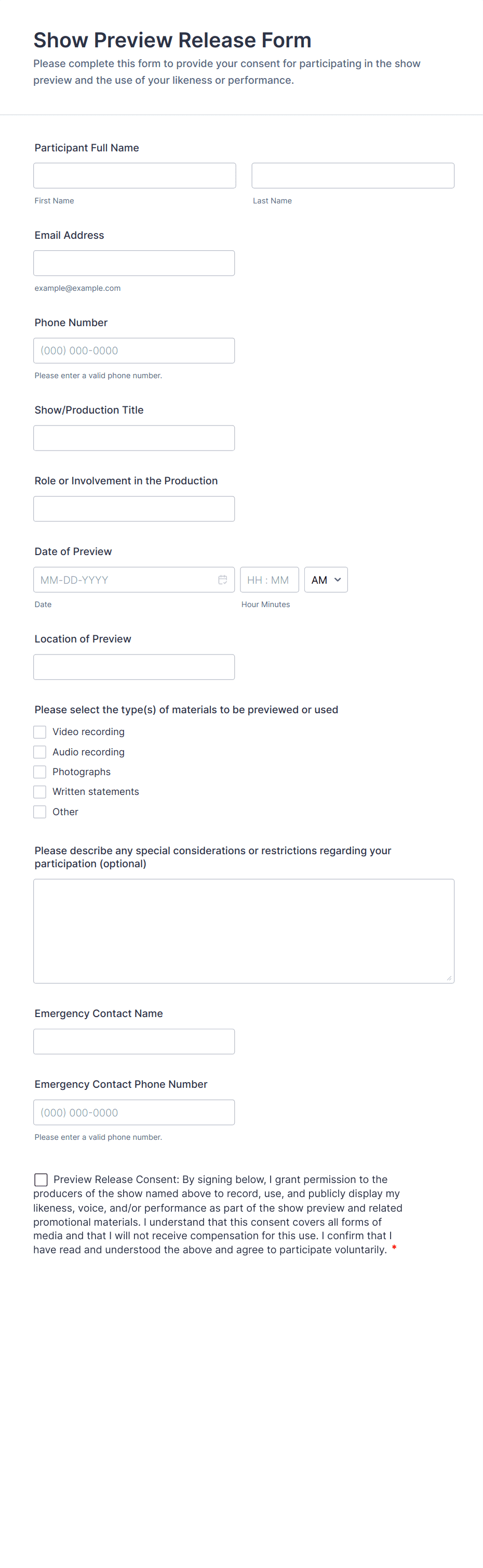 - For specialized releases, include conditional logic to show or hide fields based on user responses (e.g., show parent fields if the participant is under 18).