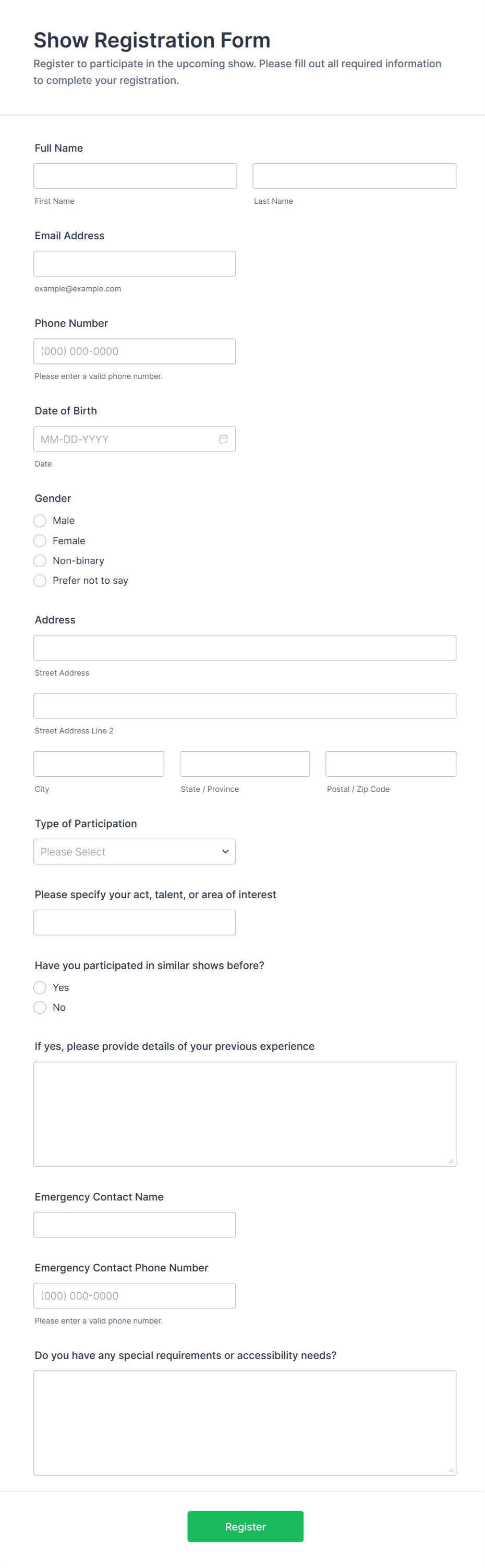 Event Registration Forms are digital tools designed to streamline the process of collecting attendee information for a wide variety of events, such as conferences, workshops, webinars, fundraisers, classes, and social gatherings. These forms allow organizers to gather essential details like participant names, contact information, payment preferences, dietary restrictions, and session selections. By using event registration forms, event planners can efficiently manage RSVPs, track attendance, and ensure a smooth check-in process on the day of the event. The flexibility of these forms makes them suitable for both small private gatherings and large-scale public events, adapting to the unique requirements of each occasion.