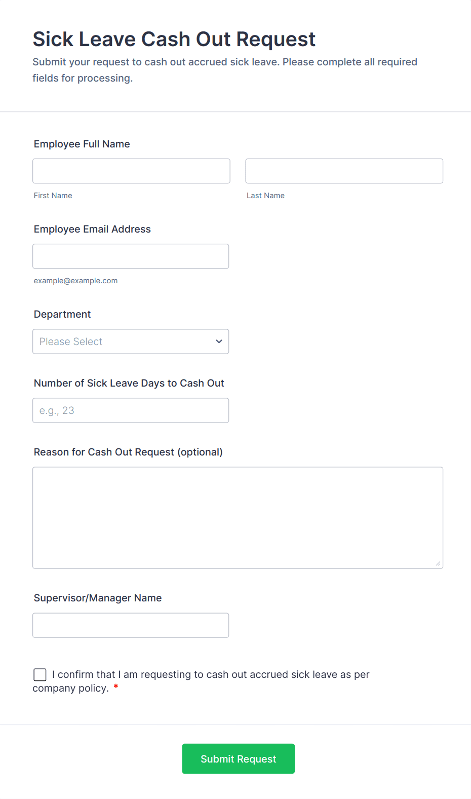 Leave Request Form Templates are digital forms designed to streamline the process of requesting and managing employee absences within organizations. These templates are commonly used by HR departments, team leaders, and managers to collect essential information from employees who need to take time off for reasons such as vacation, sick leave, personal days, parental leave, or other special circumstances. By standardizing the leave request process, these forms help ensure that all necessary details—such as dates, type of leave, reason for absence, and approval status—are captured efficiently and consistently. Use cases range from small businesses tracking vacation days to large enterprises managing complex leave policies across multiple departments.
