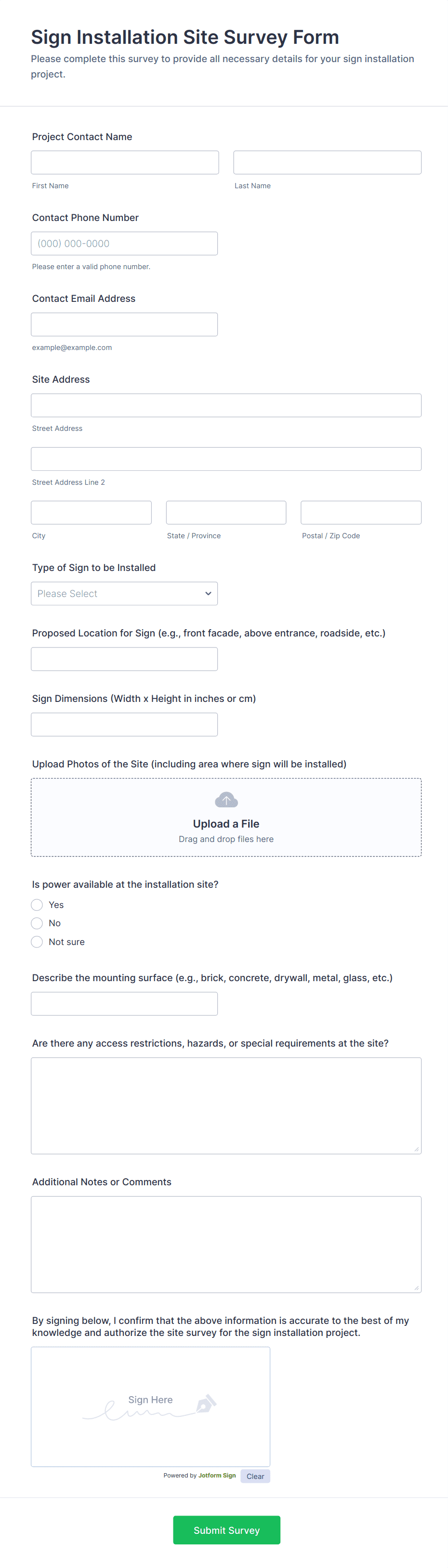 Collect accurate pre-installation details with the Sign Installation Site Survey Form, ideal for sign companies, contractors, and facilities teams to standardize site checks, reduce install-day surprises, and speed up project planning with Jotform.