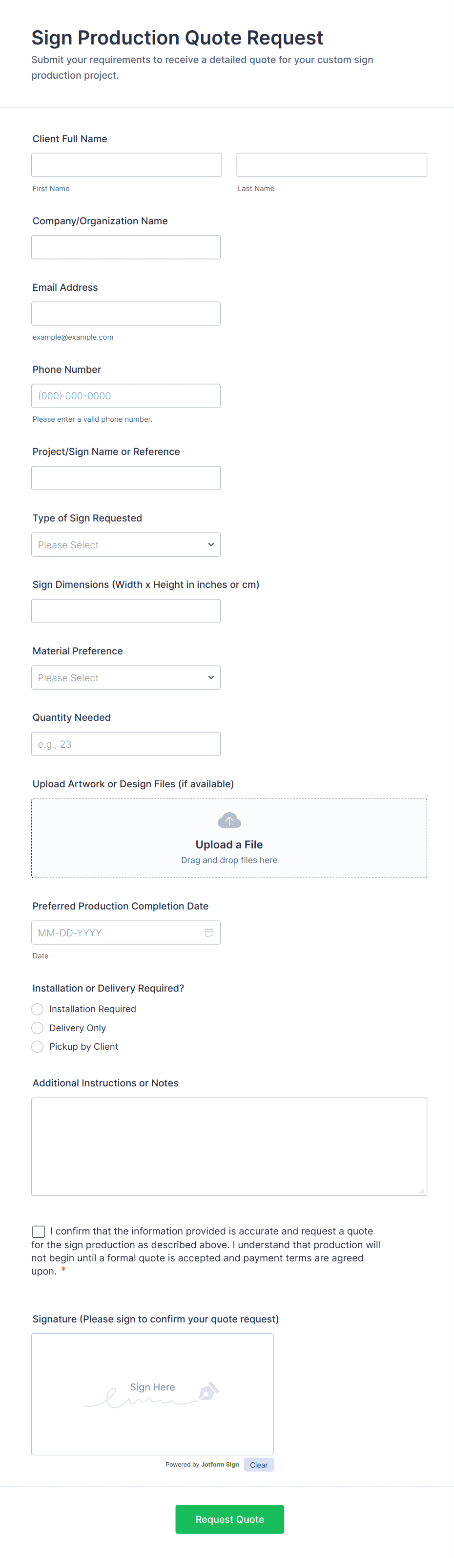 Typical fields include contact details, service or product selection, quantity, project specifications, preferred dates, and any additional requirements relevant to the quote.
