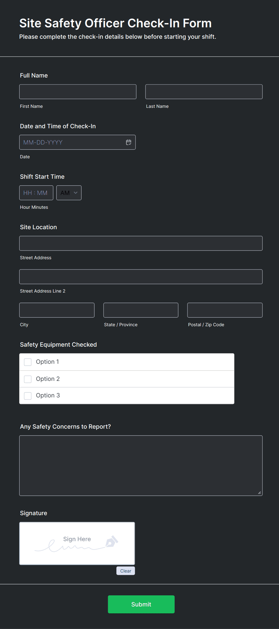 • Conditional Logic: Some forms may use conditional fields to display additional questions based on previous answers (e.g., if a hazard is found, prompt for corrective action details).