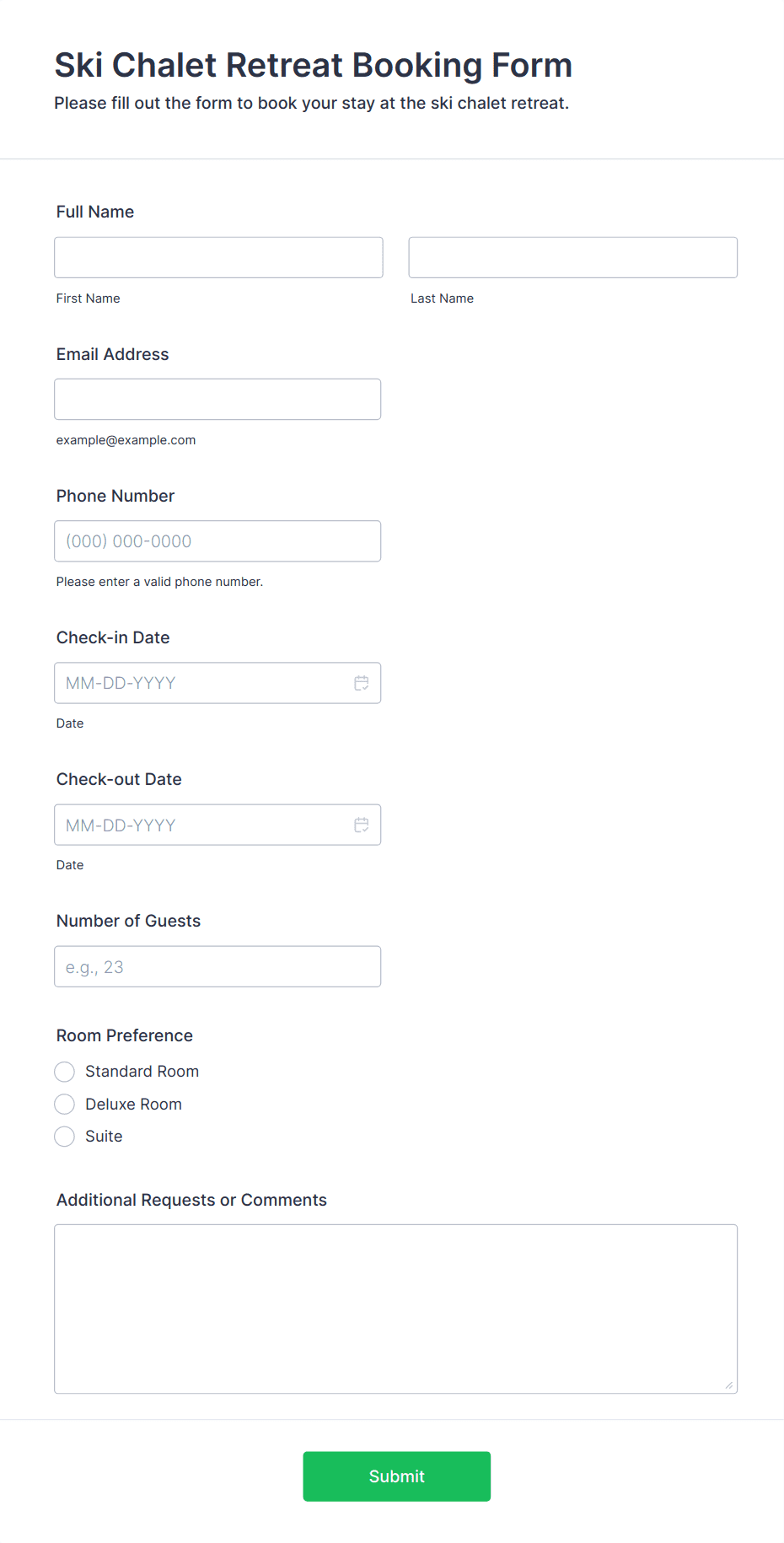 A simple form template which allows customers to submit their booking inquiry or any other comment with their contact information that would allow you to conveniently respond your customers to confirm the booking availability.