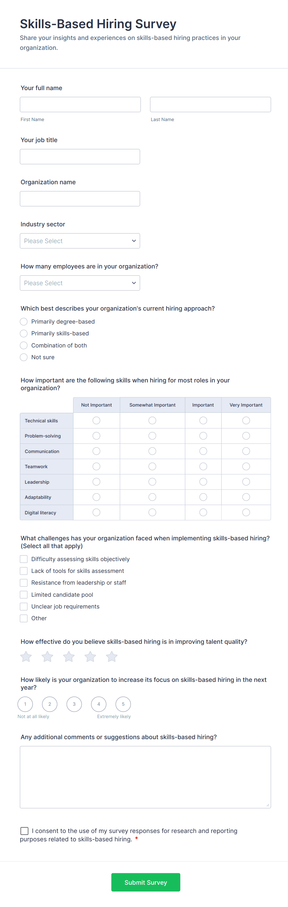 A Human Resources Survey is a structured questionnaire used by HR departments to collect feedback, opinions, and data from employees or job candidates on various workplace topics such as satisfaction, training, onboarding, and company culture.