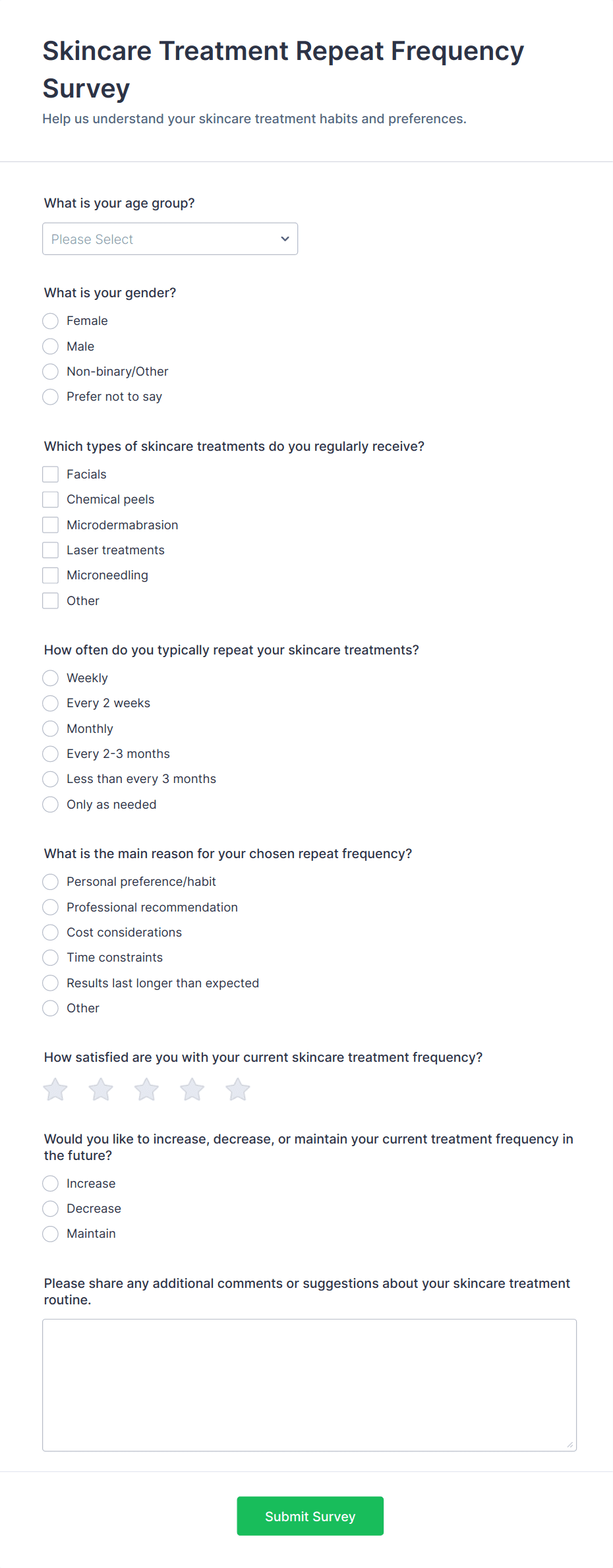 Healthcare surveys are specialized questionnaires designed to collect valuable information from patients, healthcare professionals, and other stakeholders within the medical field. These surveys can be used for a variety of purposes, such as assessing patient satisfaction, gathering feedback on healthcare services, monitoring public health trends, evaluating treatment outcomes, and conducting research studies. Healthcare organizations, clinics, hospitals, and research institutions rely on these surveys to improve patient care, streamline operations, and ensure compliance with industry standards.