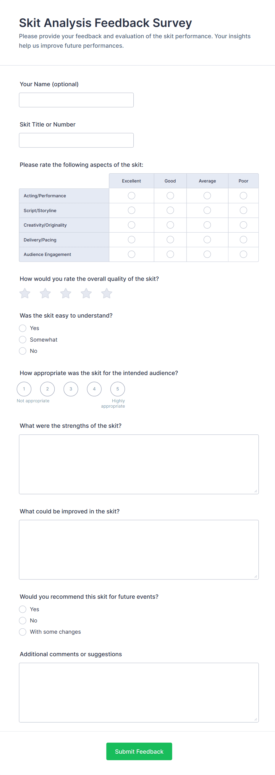 • For event feedback, include ratings for organization, content, and logistics, as well as open-ended suggestions.