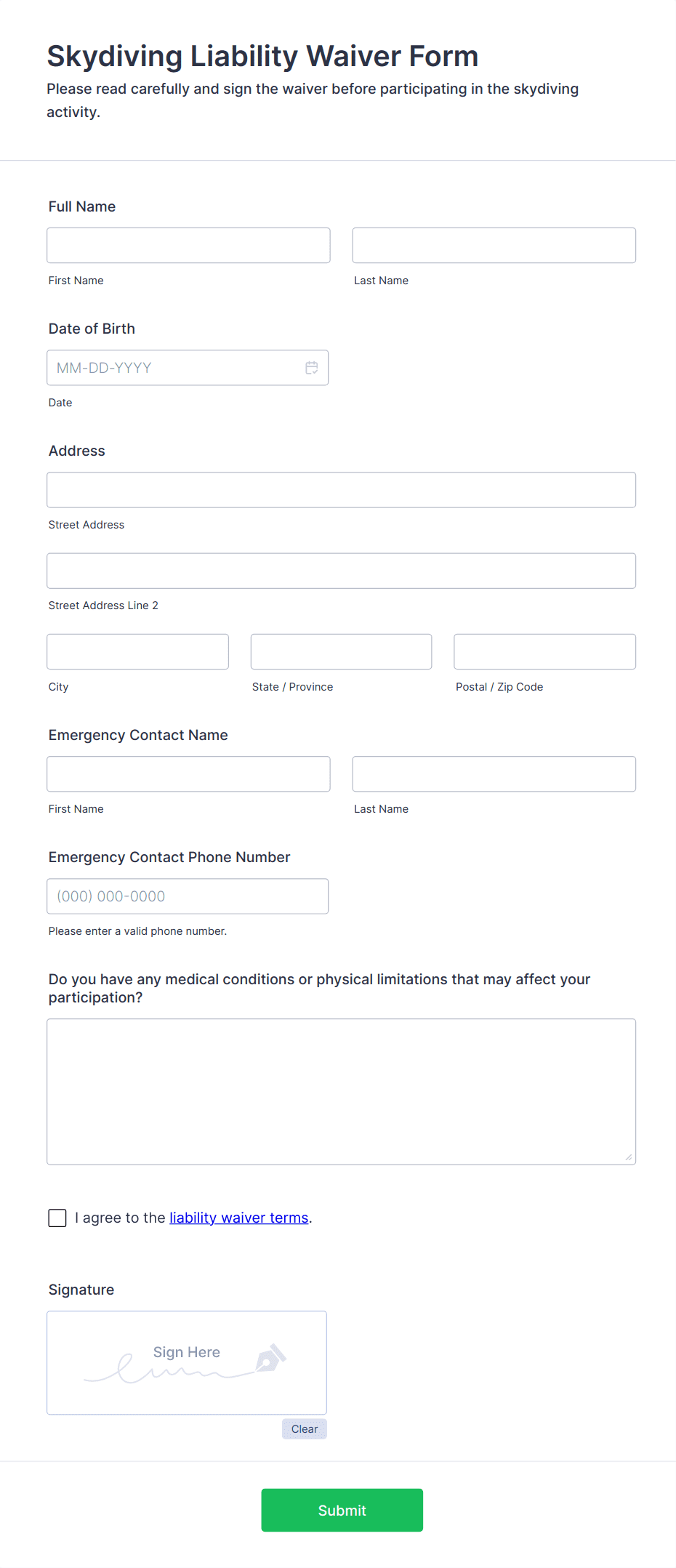 - Content and fields vary by use case: A gym waiver may require health disclosures, while a school field trip waiver may need emergency contact information.