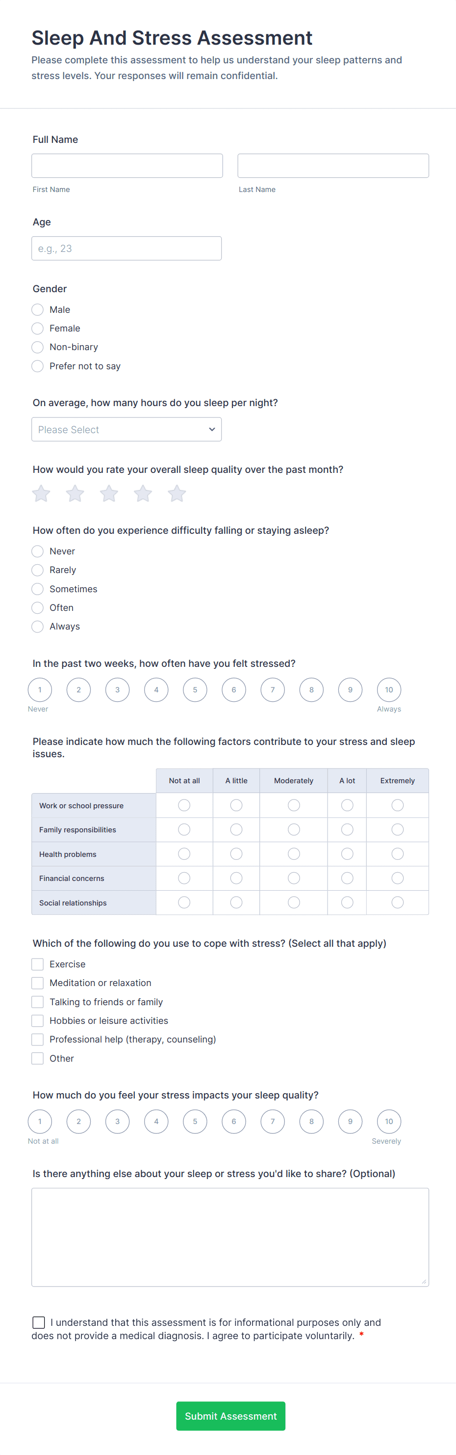 Add fields for symptoms, medical history, medications, allergies, lifestyle factors, and functional status depending on the assessment type. Use rating scales for severity and impact.