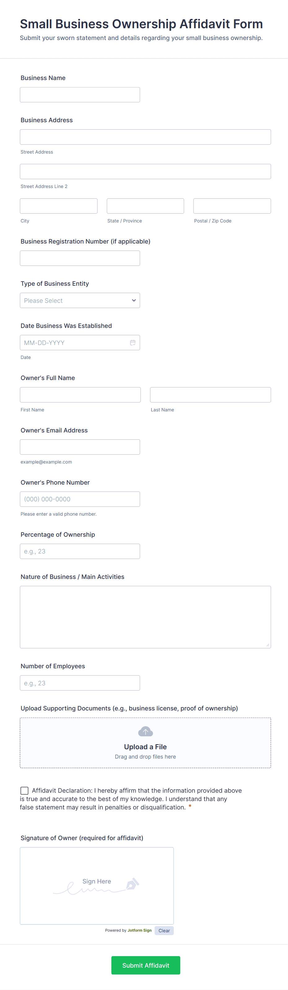 The form templates here are for informational purposes only. Jotform is not providing legal, financial, or other advice, or implying that the forms are legally valid in all or any jurisdictions. Before using any such form, consult an attorney and/or other applicable professionals to make sure that the form meets your needs, legally and otherwise.