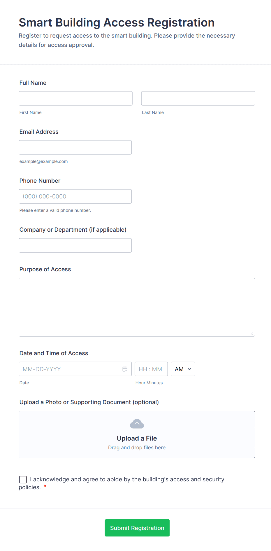• Maintenance Requests: Tenant name, unit number, issue description, urgency level, file upload for photos.