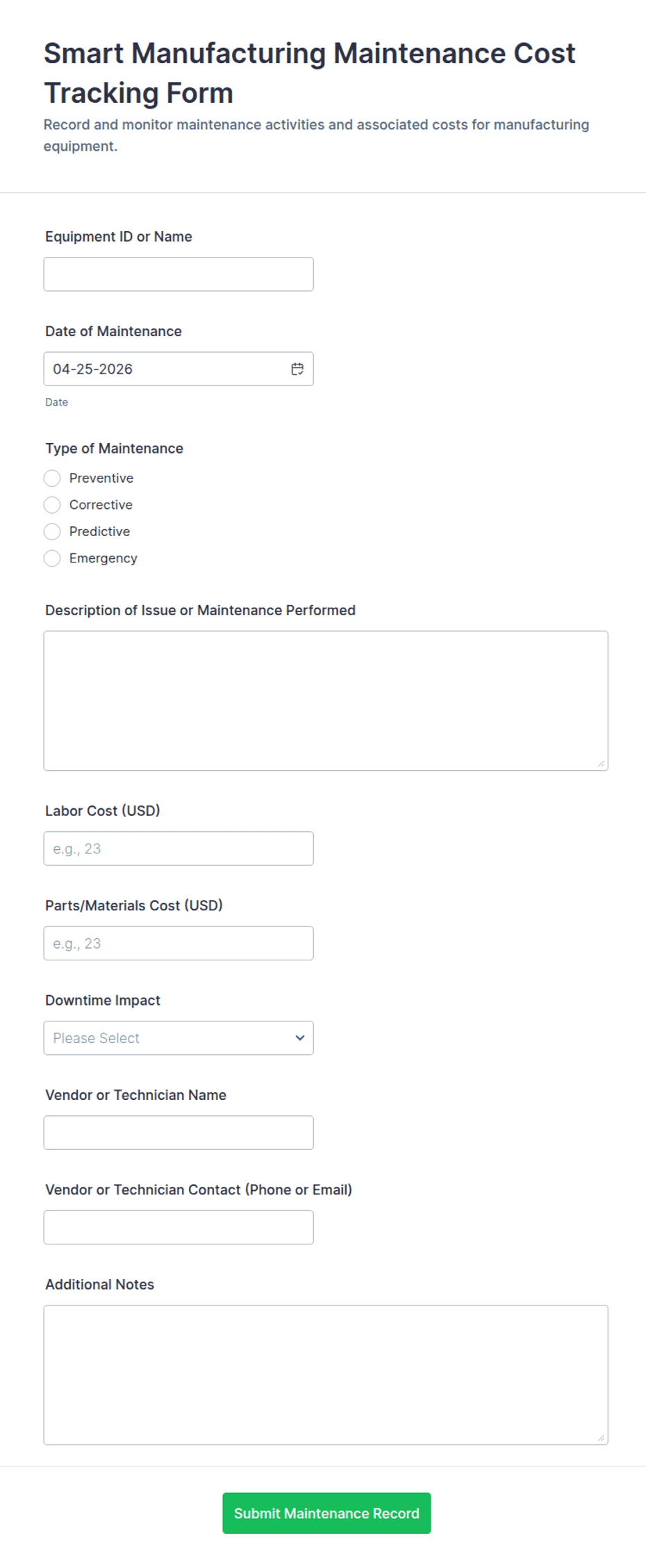 Equipment maintenance forms are structured documents used to report, schedule, and document maintenance activities for equipment and assets. They help teams track maintenance needs, record service actions, and maintain a clear history of repairs, inspections, and preventive maintenance. Equipment maintenance forms are commonly used in manufacturing, facilities, healthcare, laboratories, construction, and IT environments to reduce downtime and extend equipment lifespan. Typical workflows include maintenance requests, inspection logs, preventive maintenance checklists, repair reports, and service completion confirmations. By standardizing maintenance documentation, these forms improve response time, support compliance, and make maintenance planning more reliable.