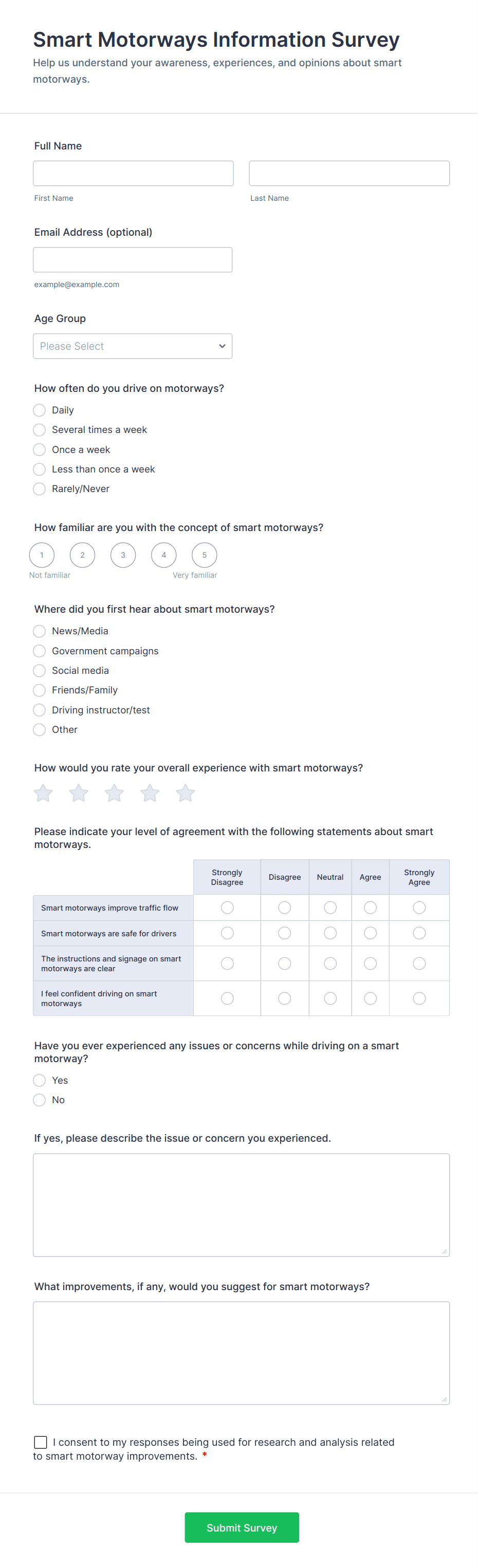 Survey templates are pre-designed forms that help individuals and organizations collect feedback, opinions, or data from a target audience. These templates are widely used for a variety of purposes, such as customer satisfaction surveys, employee engagement assessments, market research, event feedback, and academic studies. By providing a structured set of questions, survey templates streamline the process of gathering valuable insights, making it easier to analyze trends, measure satisfaction, and make informed decisions. Whether you’re a business owner, HR professional, educator, or researcher, survey templates offer a quick and effective way to reach your audience and collect actionable information.