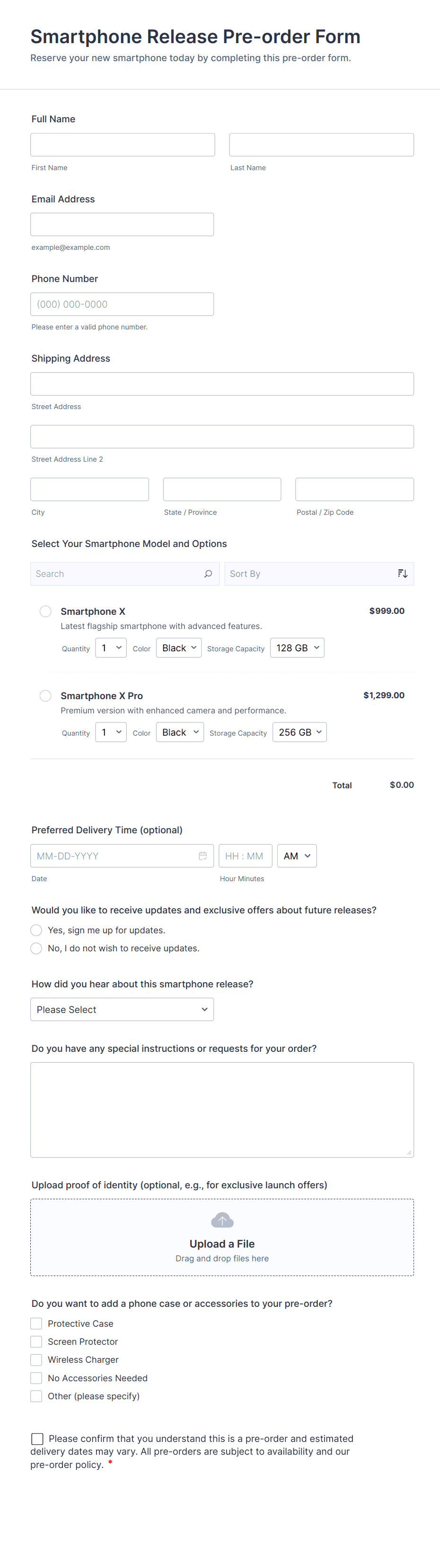 Preorder forms are specialized online forms designed to collect advance orders for products or services before they are officially released or available for general sale. Businesses, creators, and organizations use preorder forms to gauge demand, secure early sales, and streamline inventory planning for upcoming launches. These forms are commonly used for new product releases, limited-edition items, event tickets, seasonal goods, or even digital content. By allowing customers to reserve or purchase items ahead of time, preorder forms help businesses manage expectations, reduce the risk of overproduction, and build excitement around new offerings.