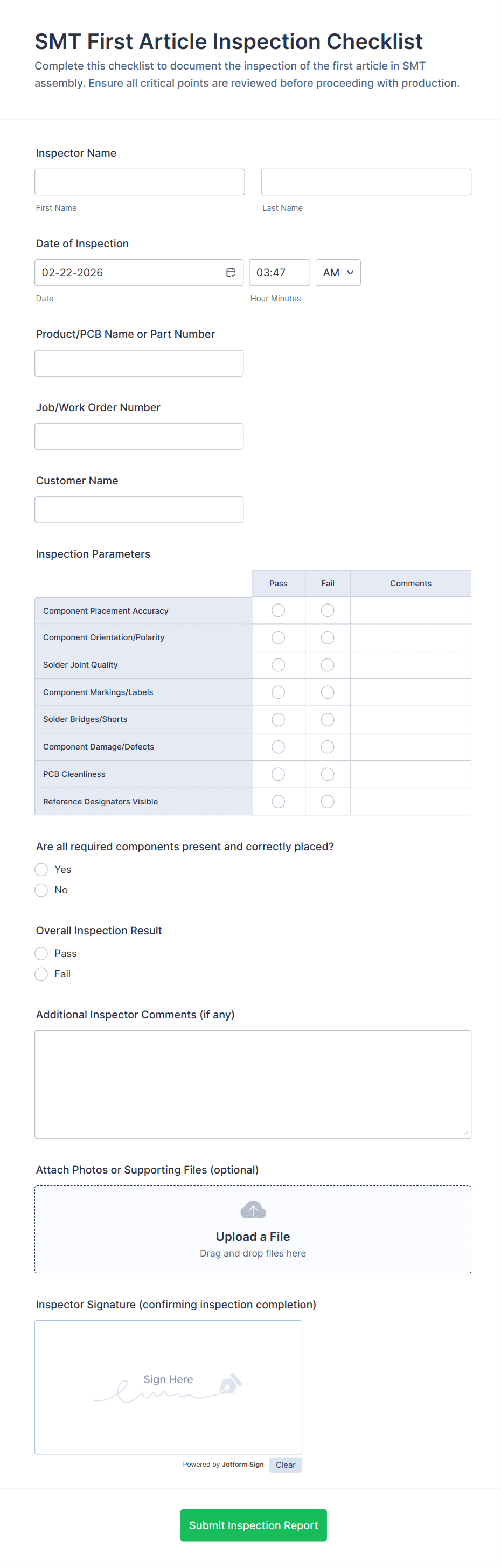 An inspection form is a structured document used to assess, record, and report the condition, compliance, or quality of assets, environments, or processes during an inspection.