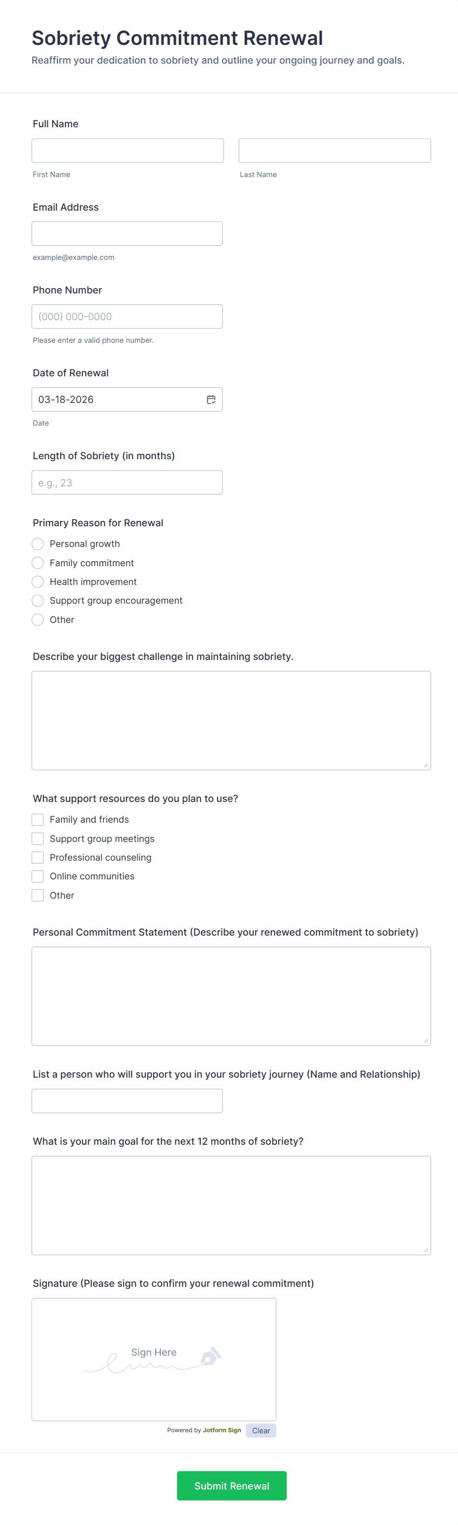 Counselor Certification Renewal Application Form helps licensing boards and organizations collect renewal requests online, track continuing education details, and manage data collection and form submissions with Jotform.