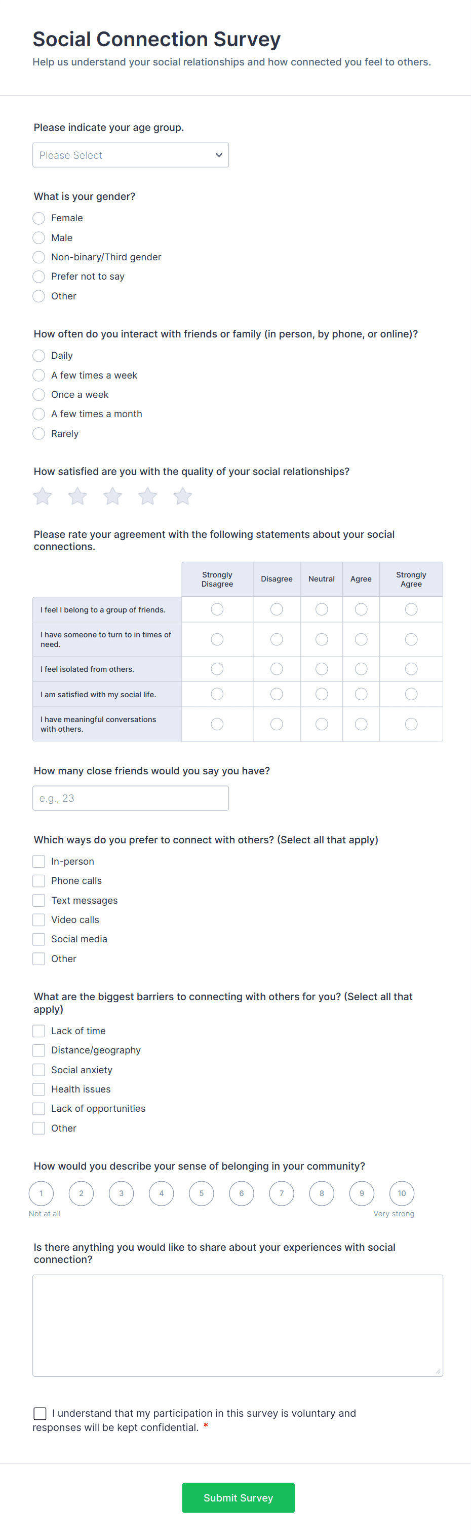 Ask people how they feel about relationships. Free online relationship questionnaire. Perfect for research. Easy to customize and fill out. No coding.
