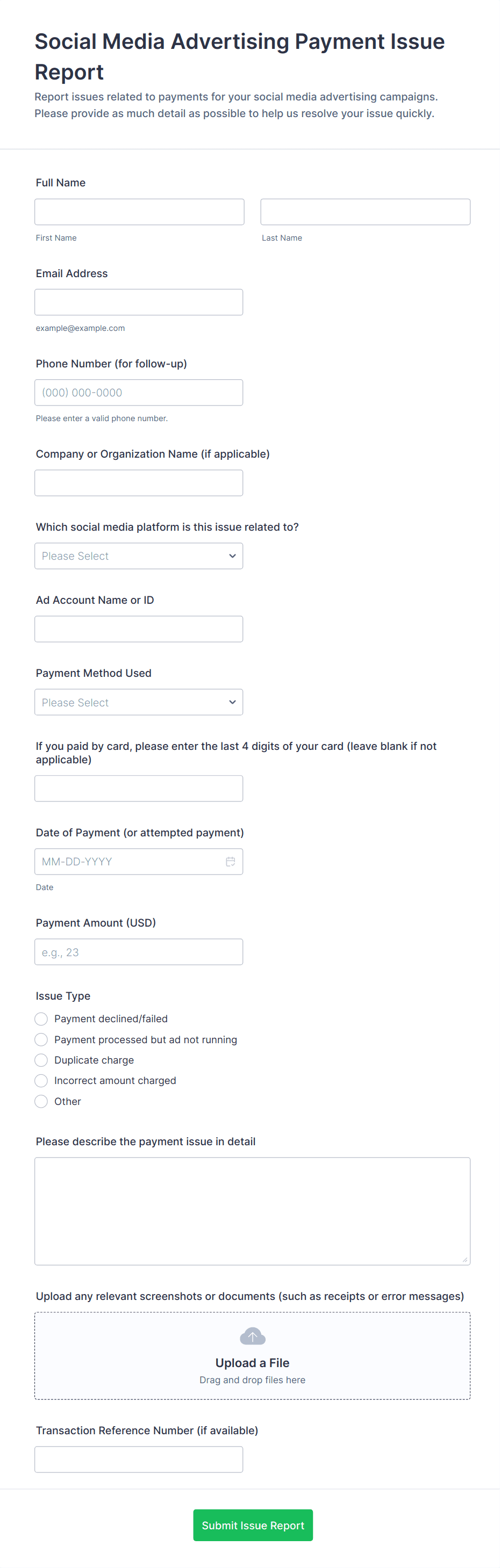 • For business reports: Include fields for dates, metrics, comments, and file uploads.