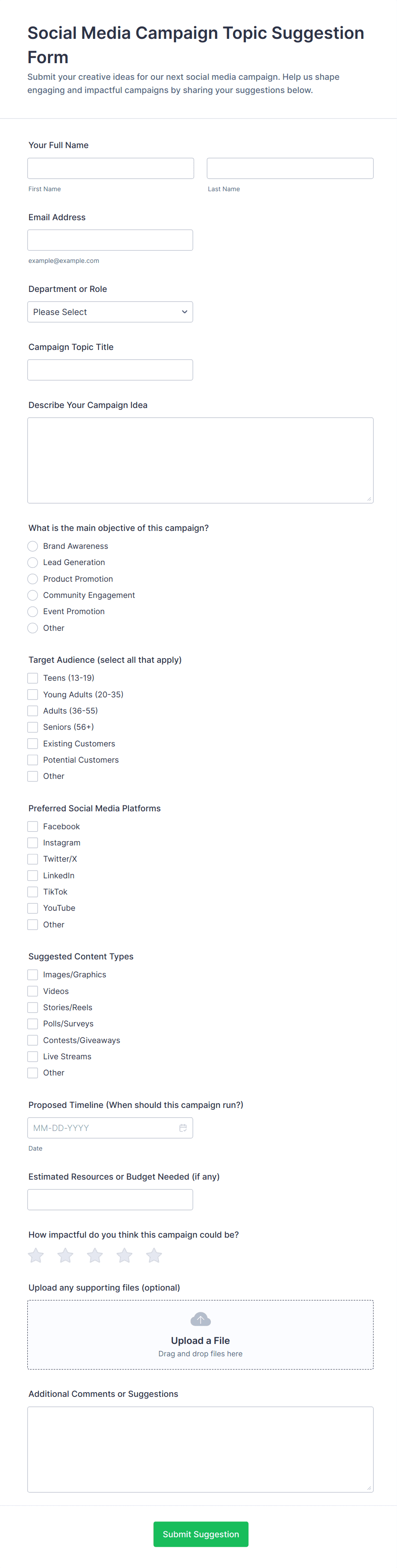 • Social media content submission forms for user-generated content campaigns.