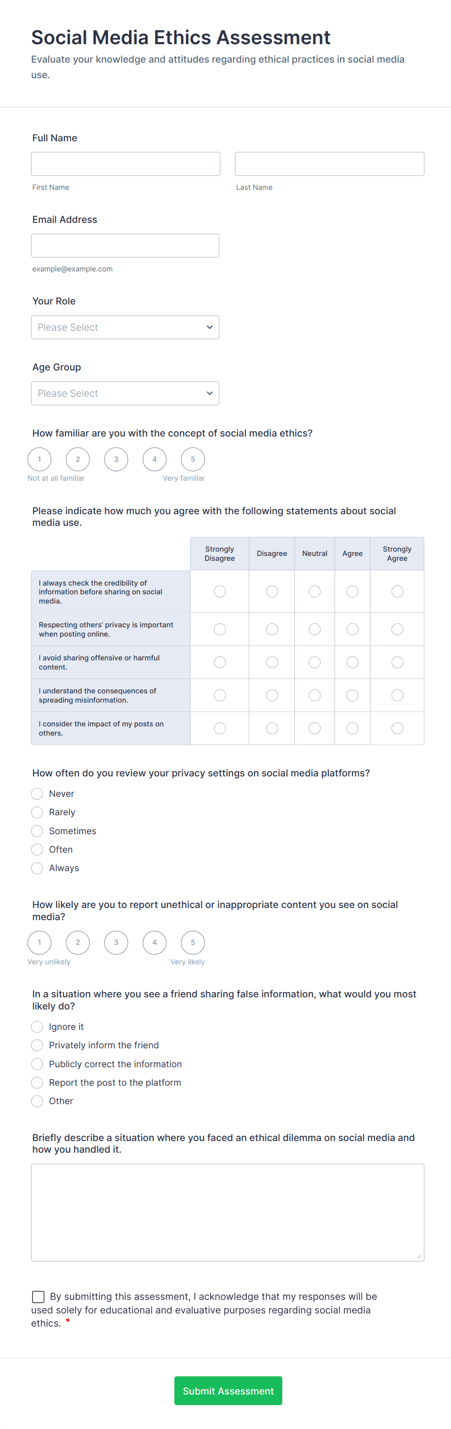 Assessment forms may include personal details, multiple-choice or open-ended questions, rating scales, comment sections, and sometimes automated scoring or feedback fields, depending on the purpose.