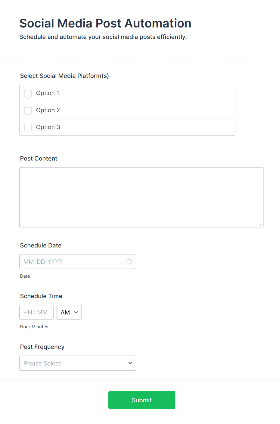 Gather social media post requests from coworkers and partners with this free form. Easy to customize, embed, and share. Works on any device. No coding.