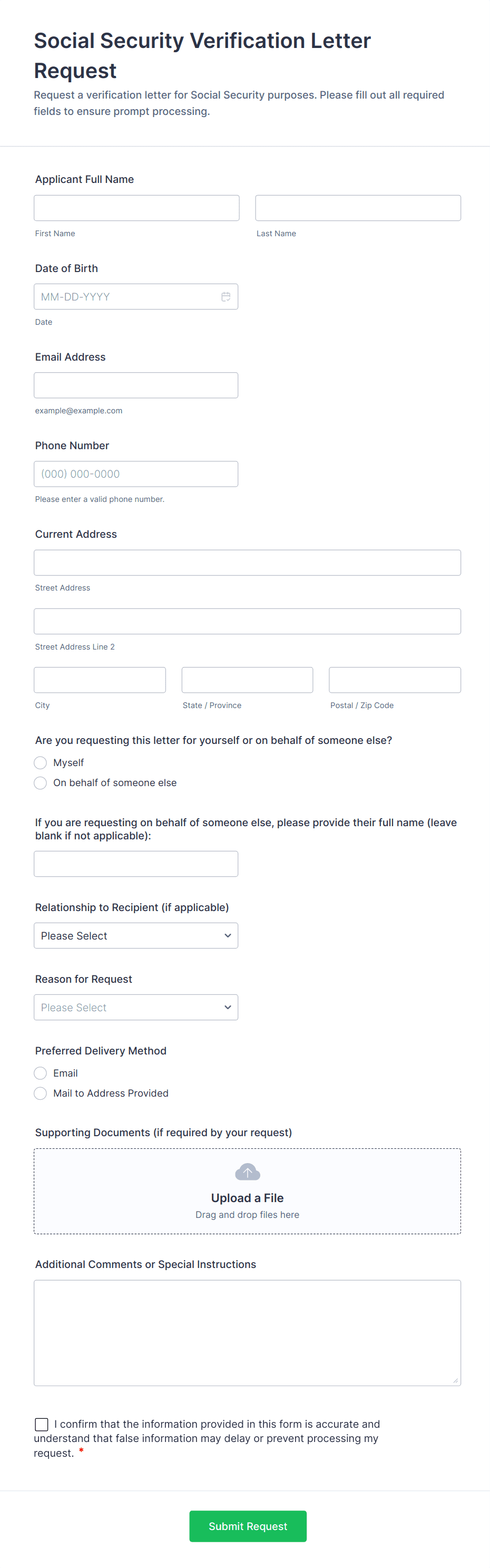 • Use dropdowns or multiple-choice fields to specify the type of verification (e.g., identity, employment, address).