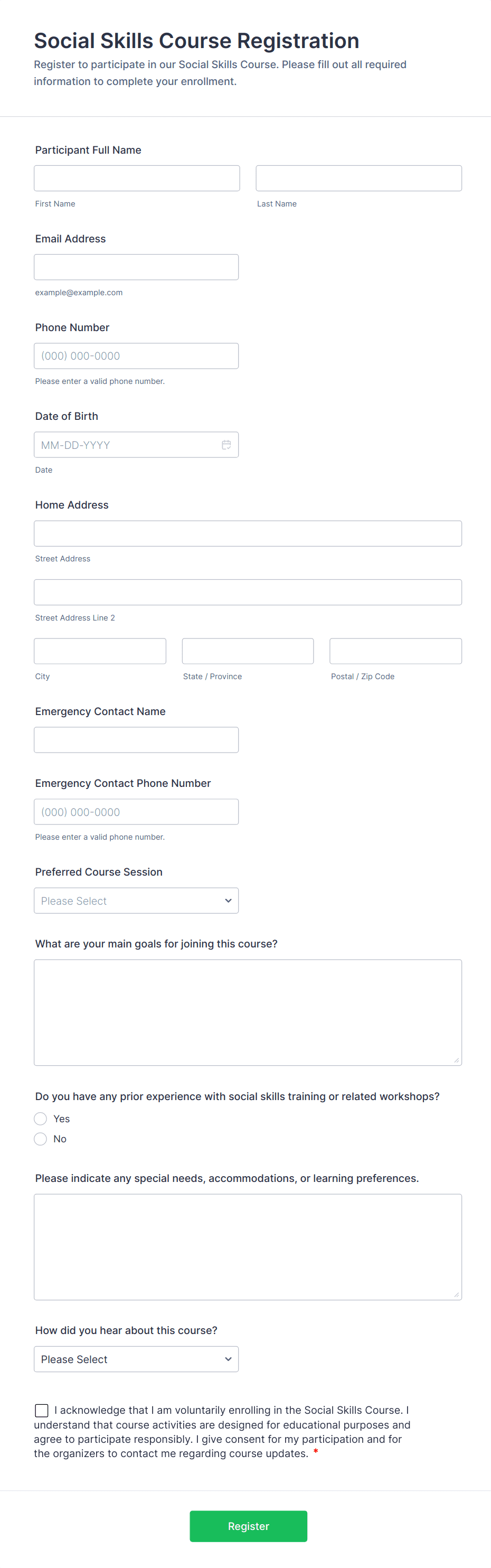 Typical fields include participant name, contact details, session selection, payment information, dietary or accessibility needs, and consent agreements.