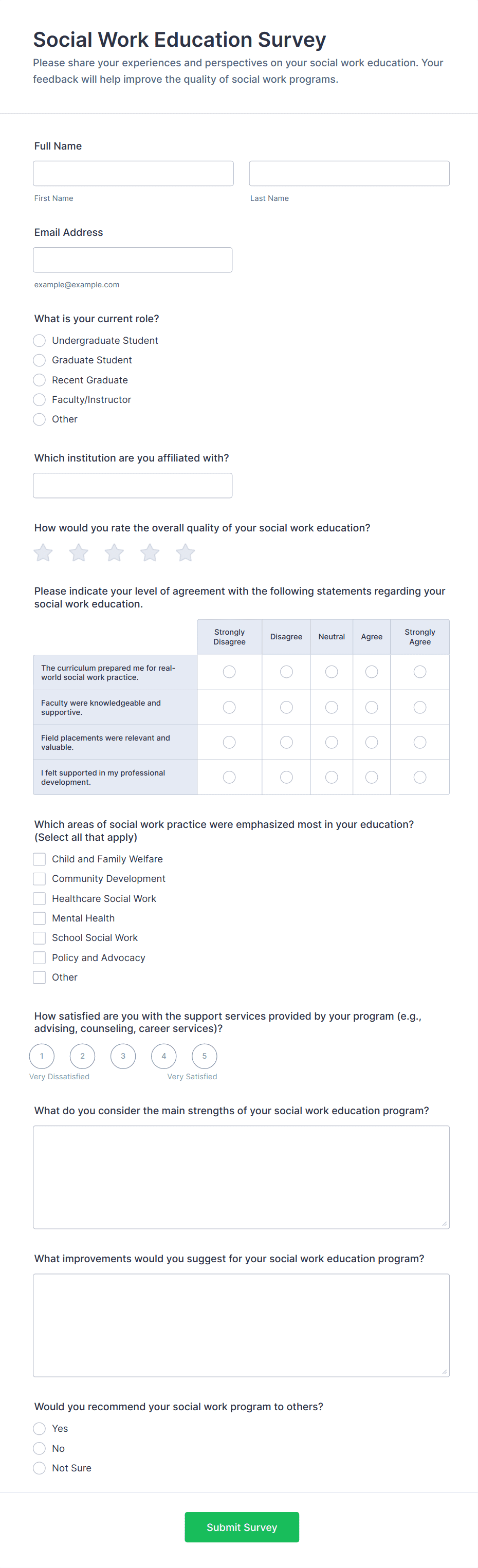 • Student Surveys: Focus on course content, teaching style, and classroom environment. May include rating scales, open-ended questions, and demographic fields.