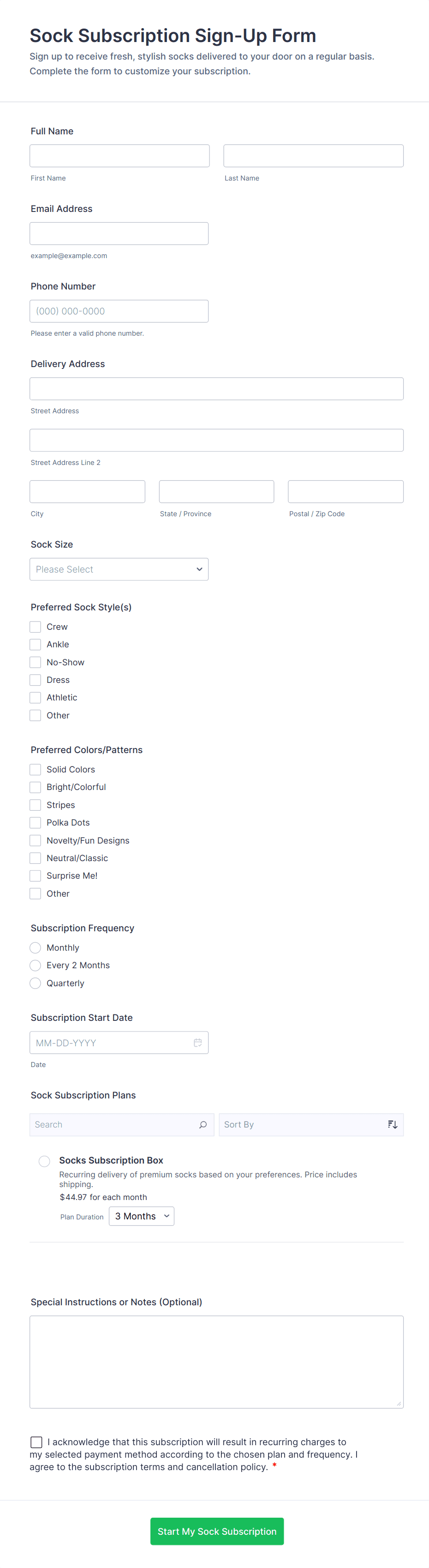 A subscription form is an online form used to collect information from individuals who wish to sign up for recurring services, communications, or memberships, such as newsletters, product deliveries, or club memberships.
