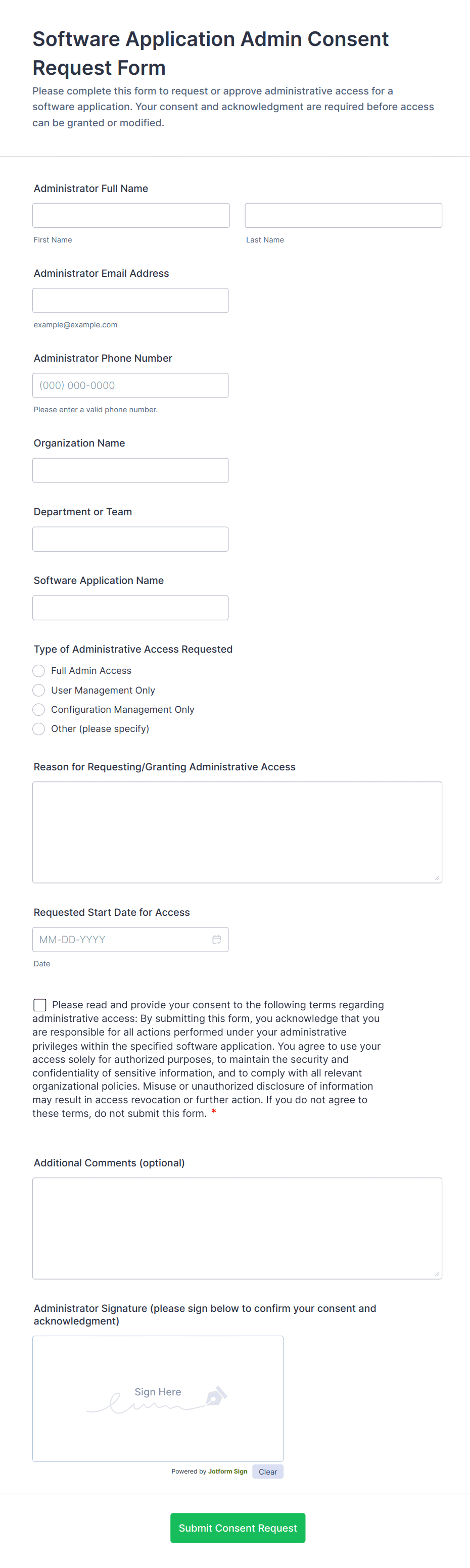 Access control forms are structured documents used to request, approve, and document access to physical locations, systems, or restricted resources. They help organizations manage who can enter certain areas, use specific equipment, or access sensitive digital systems by collecting consistent details such as requester identity, access level, justification, and approval records. Access control forms are commonly used in offices, campuses, data centers, hospitals, warehouses, and IT environments for badge requests, visitor access, temporary passes, role-based system access, and permission changes. By standardizing access requests, these forms reduce security risks, improve accountability, and create clear audit trails.