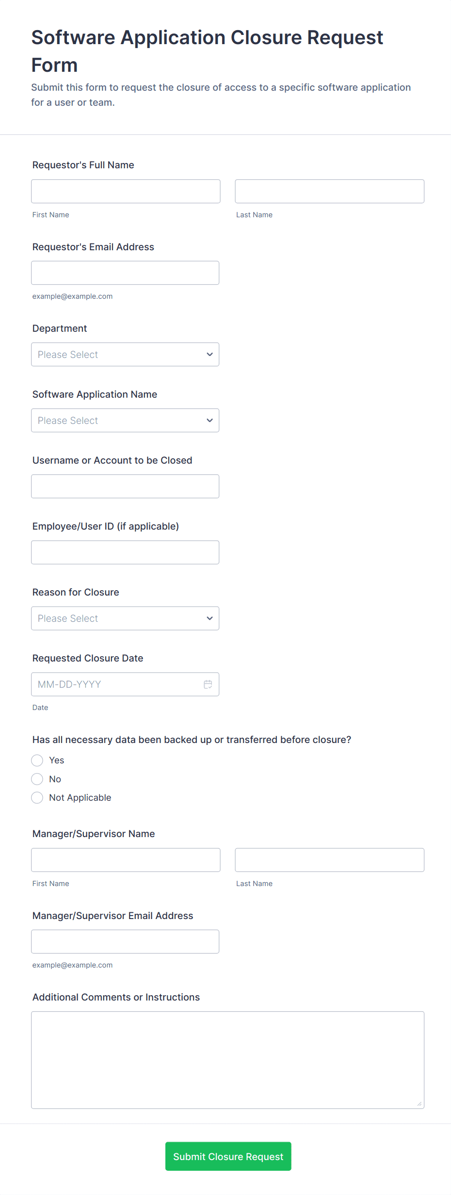 - Physical access request forms focus on location or building selection, access level, time window, badge details, and manager or security approval.