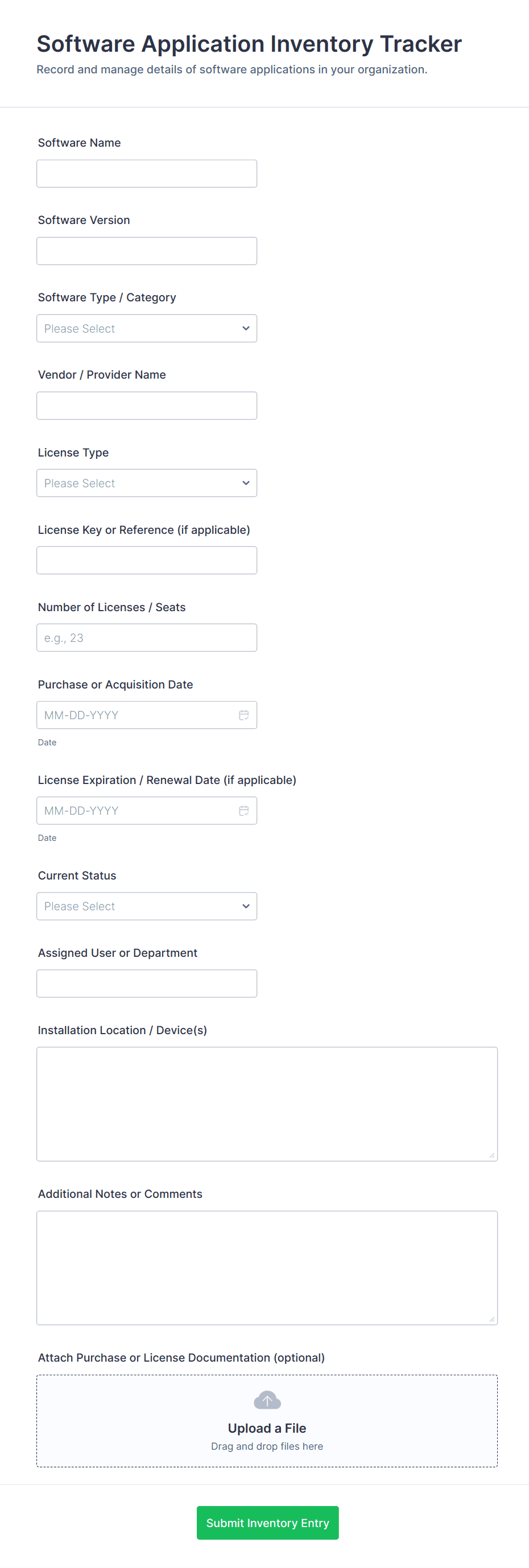 An Asset Tracking Form is a digital tool used to record, monitor, and manage information about physical or digital assets, such as equipment, inventory, or vehicles, throughout their lifecycle.