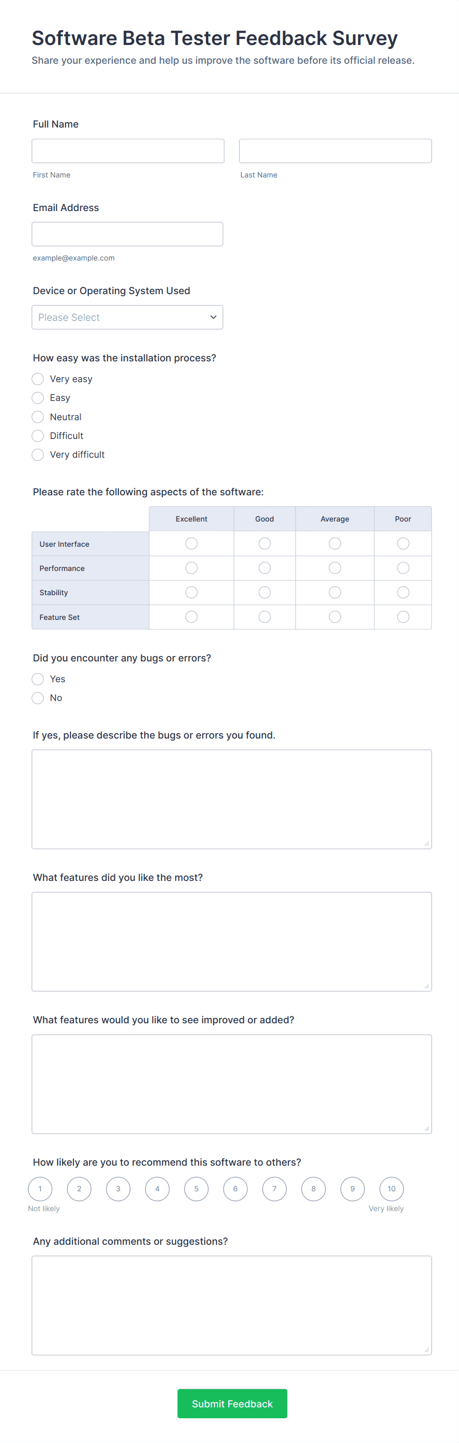 - Beta feedback forms may require fields for bug reporting and suggestions, while ongoing improvement surveys might focus on long-term user experience.