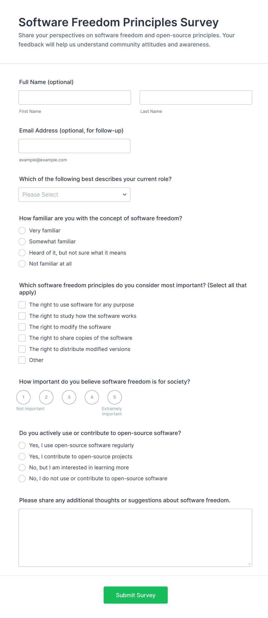 A software survey is a questionnaire used by a software company to collect feedback from its users. If you work in software, use our free Software Survey Form to talk to your customers and find out more about how they use your product!