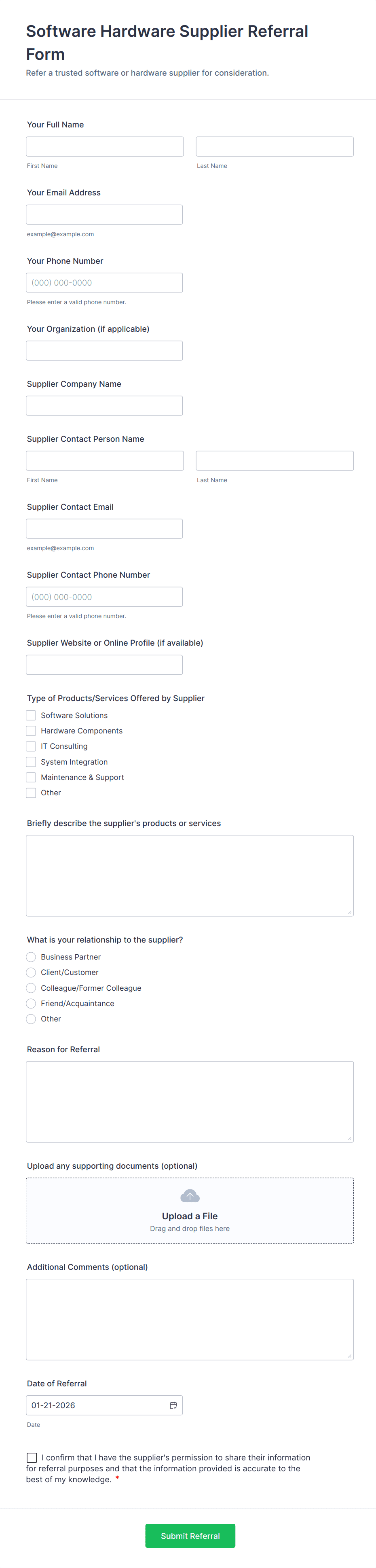 • For healthcare or sensitive referrals, include fields for privacy agreements or HIPAA compliance.