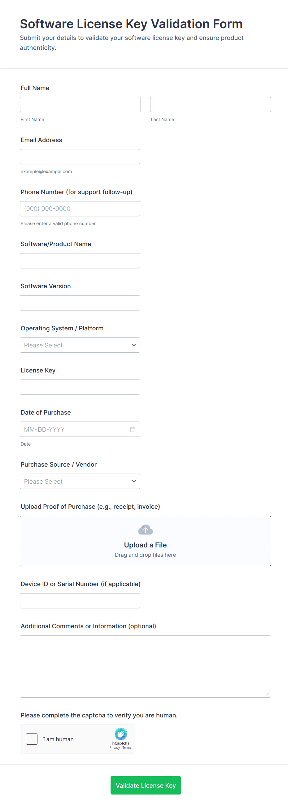 • Use dropdowns or multiple-choice fields to specify the type of verification (e.g., identity, employment, address).