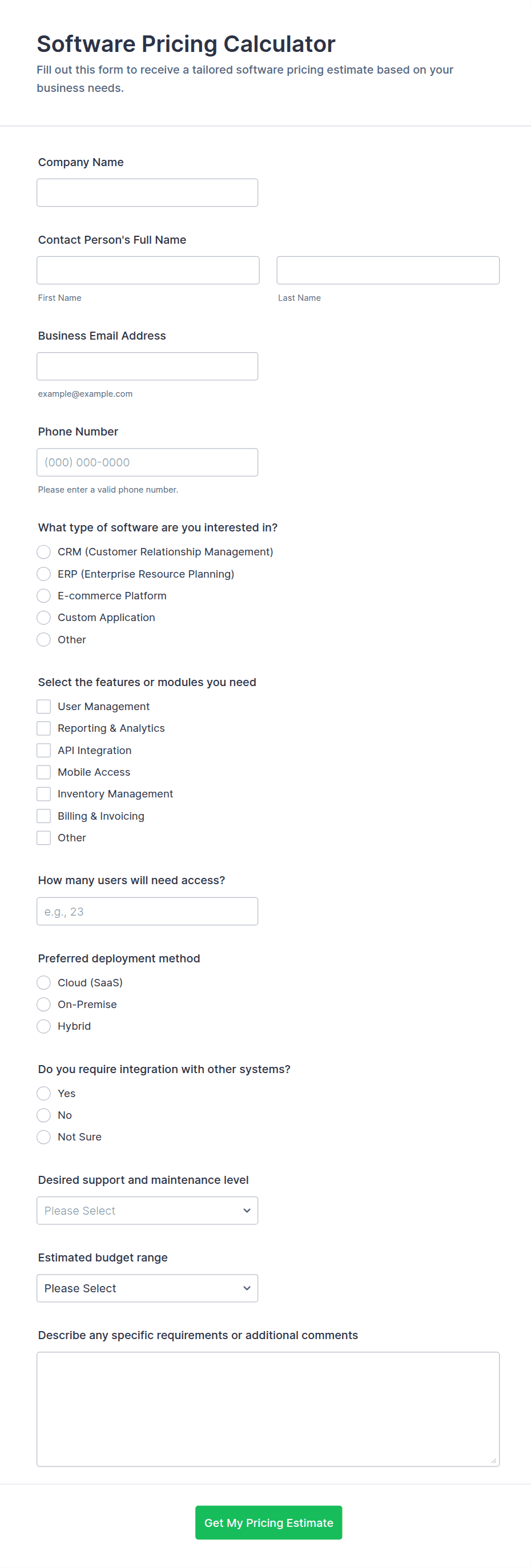 Calculation forms are specialized online forms designed to perform automatic calculations based on user input. These forms are commonly used to estimate costs, calculate totals, generate quotes, assess scores, or process any data that requires real-time mathematical operations. Typical use cases include order forms that tally product prices, loan calculators that estimate monthly payments, grade calculators for students, BMI calculators for health assessments, and budget planners for personal or business finance. Calculation forms streamline complex processes by providing instant results, reducing manual errors, and enhancing user experience.