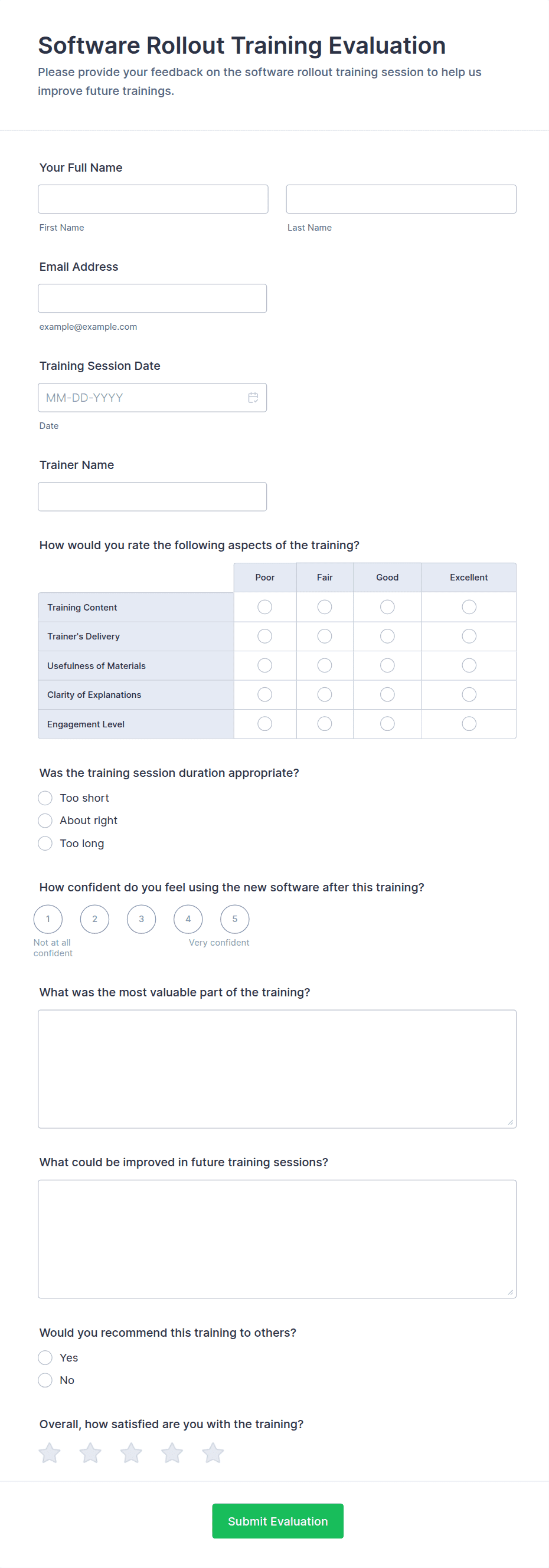 Training evaluation forms are structured documents used to collect feedback and measure outcomes after a training session, workshop, course, or onboarding program. They help organizations assess training effectiveness, instructor performance, content clarity, and learner satisfaction in a consistent way. Training evaluation forms are commonly used by HR, L&D teams, schools, corporate trainers, and program coordinators for onboarding evaluations, workshop feedback, certification programs, and internal skill training. By standardizing evaluation data, these forms make it easier to improve training content, identify skill gaps, and track program quality over time.