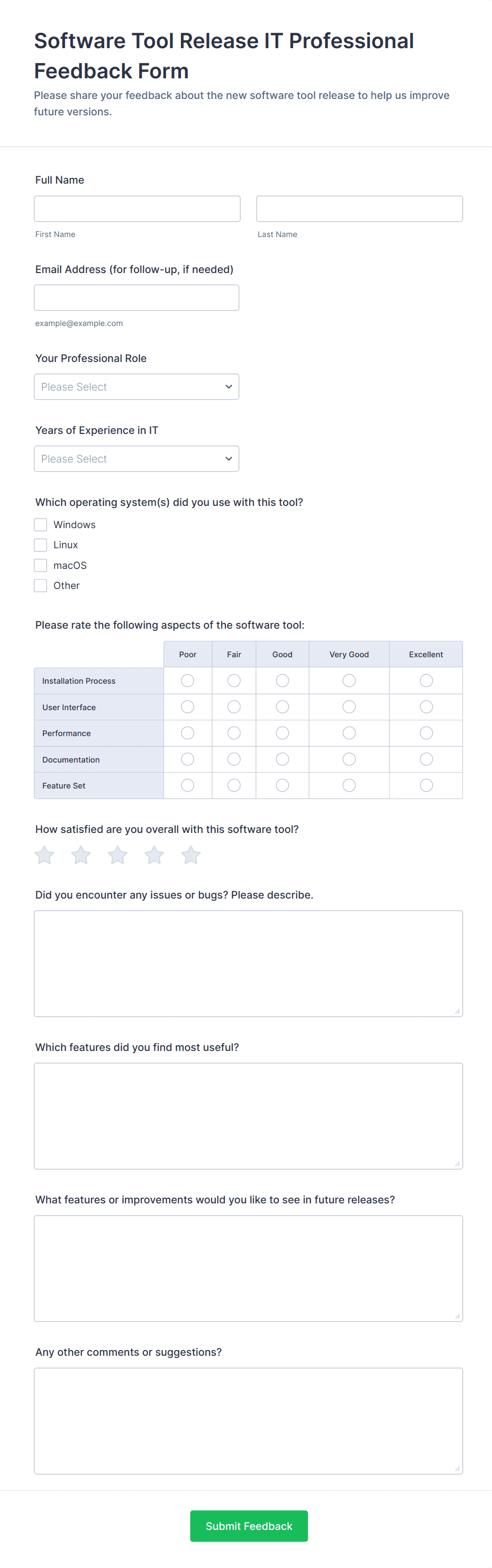 A software survey is a questionnaire used by a software company to collect feedback from its users. If you work in software, use our free Software Survey Form to talk to your customers and find out more about how they use your product!