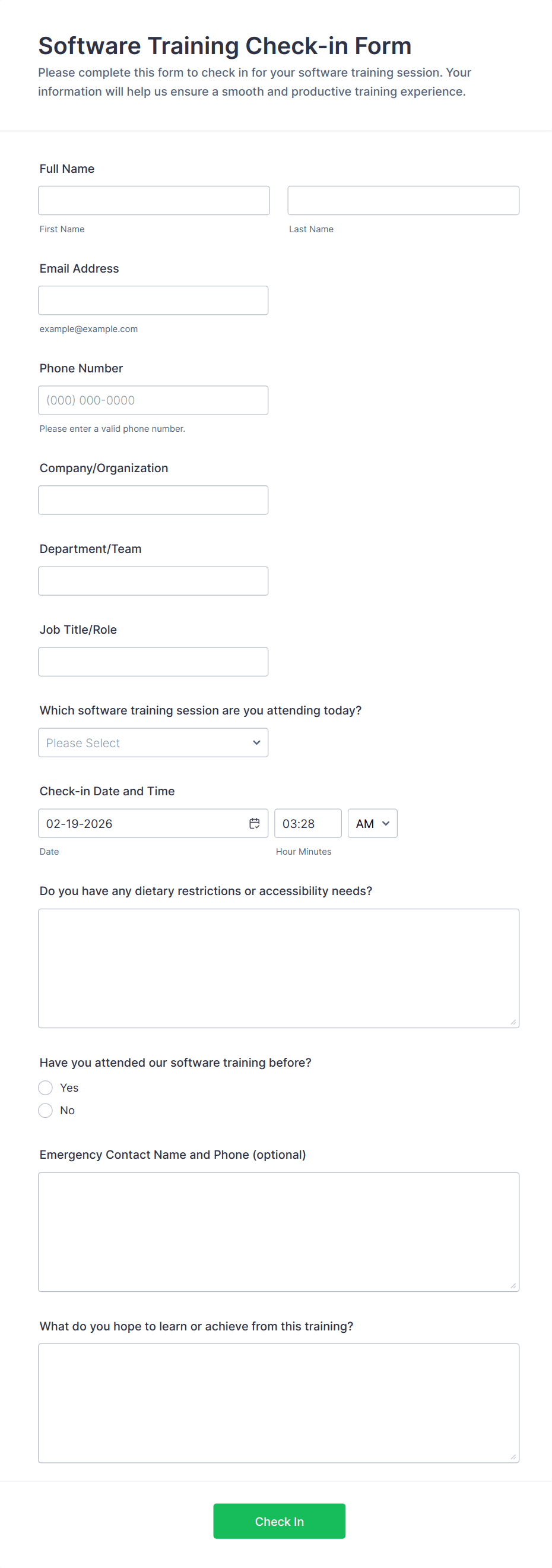 Check-In Form Templates are versatile tools that can be adapted to a wide range of industries and scenarios. They solve common challenges related to tracking attendance, ensuring security, and collecting relevant information at the point of entry. Here’s how they can be used and customized: