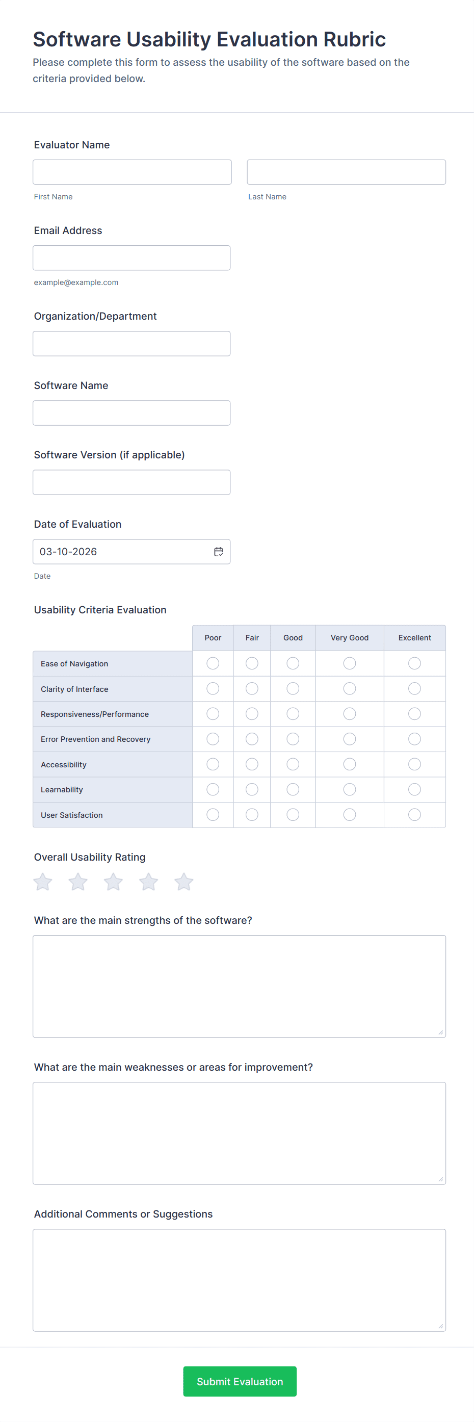 An evaluation form is a structured document or online tool used to collect feedback, assess performance, or measure satisfaction in various settings such as workplaces, schools, events, or customer interactions.